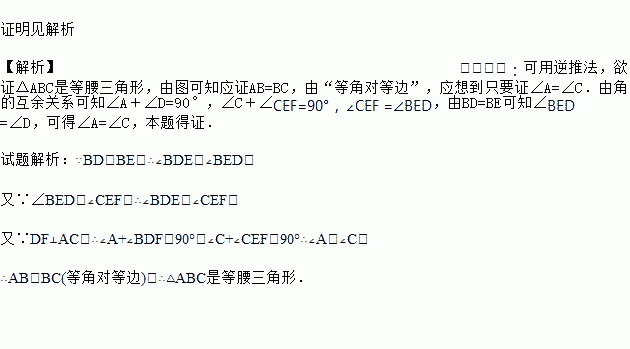 如图所示,D为△ABC的边AB的延长线上一点,过D作DF⊥AC,垂足为F,交BC于E,且BD=BE,求证:△ABC是等腰三角形.