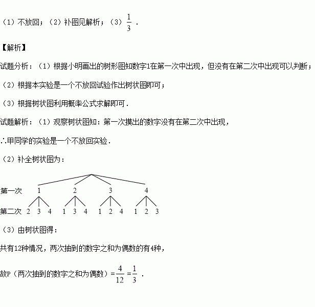 在不透明的袋子中有四张标着数字1,2,3,4 的卡片,这些卡片除数字外都相同.甲同学按照一定的规则抽出两张卡片,并把卡片上的数字相加.如图是他所画的树状图的一部分.