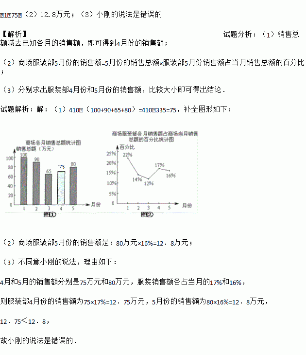 (1)75;(2)12.8万元;(3)小刚的说法是错误的 【解析】试题分析:(1)销售总额减去已知各月的销售额,即可得到4月份的销售额; (2)商场服装部5月份的销售额=5月份的销售总额×服装部5月份销售额占当月销售总额的百分比; (3)分别求出服装部4月份和5月份的销售额,比较大小即可得出结论. 试题解析:【解析】 (1)410﹣(100+90+65+80)=410﹣3...
