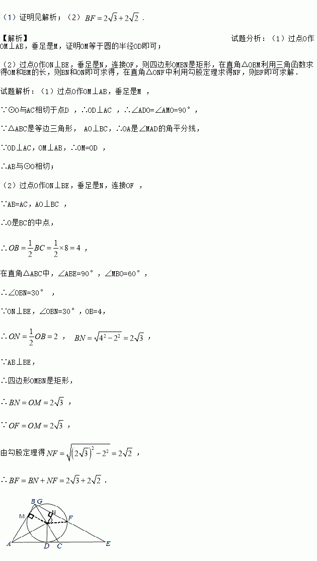如图,△ABC是等边三角形,AO⊥BC,垂足为点O,⊙O与AC相切于点D,BE⊥AB交AC的延长线于点E,与⊙O相交于G、F两点.