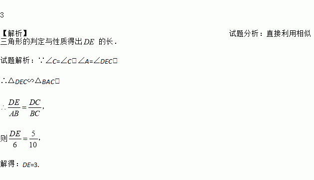 如图,在Rt△ABC中,∠A=90º,AB=6,BC=10,D是AC上一点,CD=5,DE⊥BC于E.求线段DE的长.