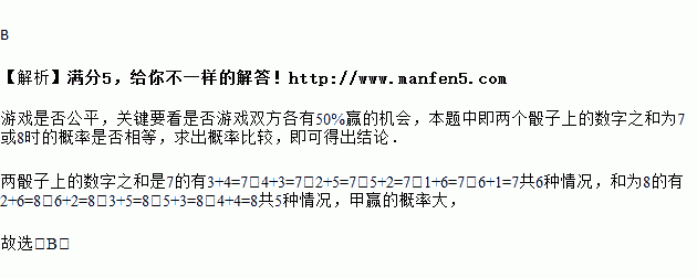 甲、乙两人投掷两个普通的正方体骰子,规定掷出“和为”算甲赢,掷出“和为”算乙赢,这个游戏是否公平?( )