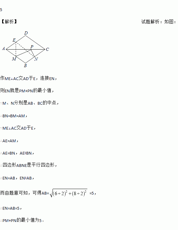 如图,菱形ABCD的两条对角线分别长6和8,点P是对角线AC上的一个动点,点M、N分别是边AB、BC的中点,则PM+PN的最小值是________.