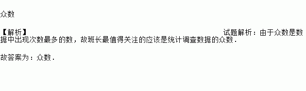 众数 【解析】试题解析:由于众数是数据中出现次数最多的数,故班长最值得关注的应该是统计调查数据的众数. 故答案为:众数.