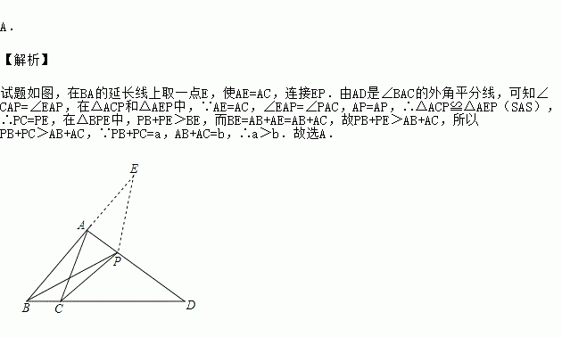 如图,在△ABC中AD是∠A的外角平分线,P是AD上一动点且不与点A、D重合,记PB+PC=a,AB+AC=b,则a、b的大小关系是( )