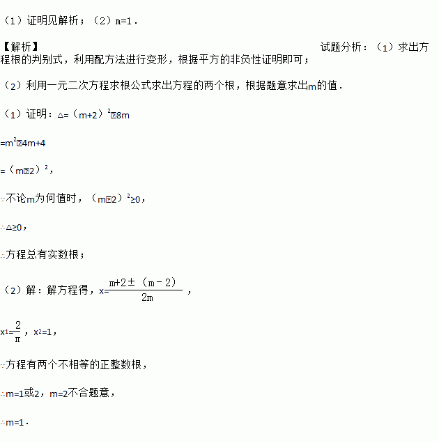 (1)证明见解析;(2)m=1. 【解析】试题分析:(1)求出方程根的判别式,利用配方法进行变形,根据平方的非负性证明即可; (2)利用一元二次方程求根公式求出方程的两个根,根据题意求出m的值. (1)证明:△=(m+2)2﹣8m =m2﹣4m+4 =(m﹣2)2, ∵不论m为何值时,(m﹣2)2≥0, ∴△≥0, ∴方程总有实数根; (2)【...