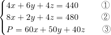 分析:假设甲种取x根,乙种取y根,丙种取z根,总成本为P元.根据题目说明列方程组