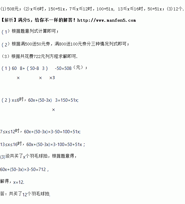 (3)该校买了羽毛球50个若干个羽毛球拍,共花费712元,请问他们买了几个羽毛球拍.