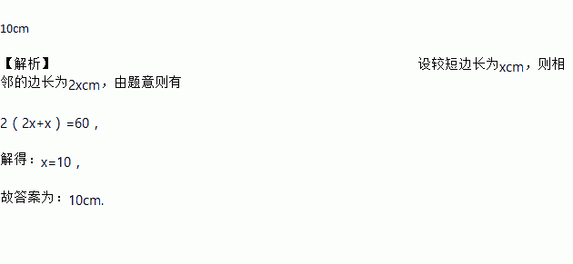 平行四边形的两条邻边的比为2:1,周长为60cm,则这个四边形较短的边长为________.