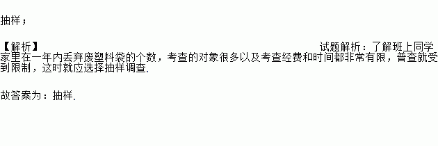 近几年,人们的环保意识逐渐增加,“白色污染”现象越来越受到人们的重视.小颖同学想了解班上同学家里在一年内丢弃废塑料袋的个数,你认为采用___调查方式合适一些.