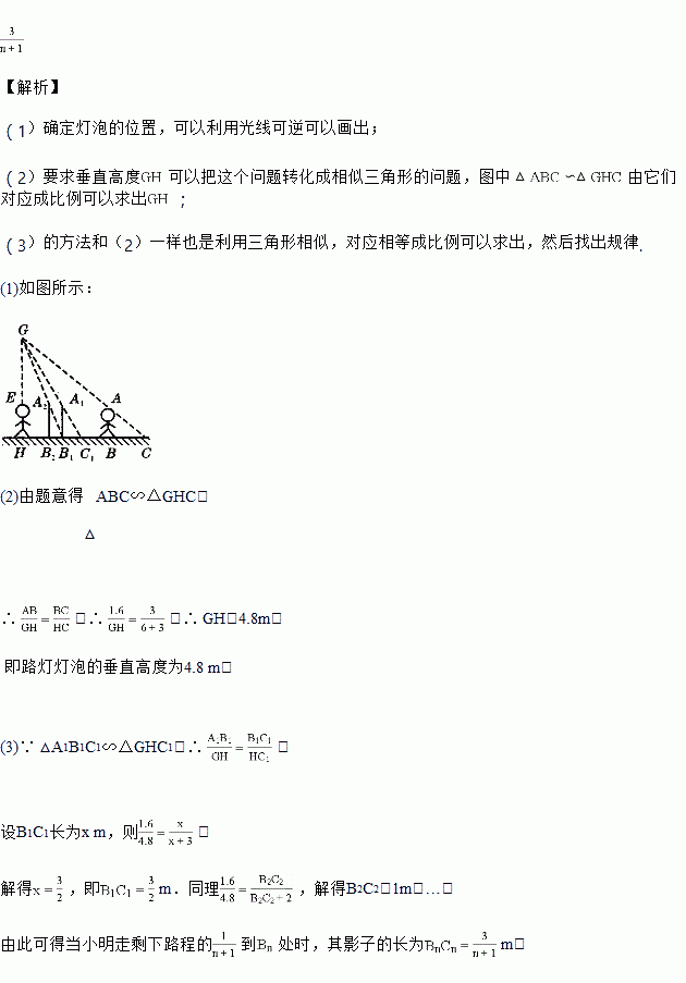 学习投影后,小明、小颖利用灯光下自己的影子长度来测量一路灯的高度,并探究影子长度的变化规律.如图所示,在同一时间,身高为1.6 m的小明(AB)的影子BC长是3m,而小颖(EH)刚好在路灯灯泡的正下方H点,并测得HB=6m.