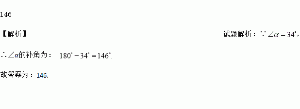 已知∠α=34°,则∠α的补角为________°.