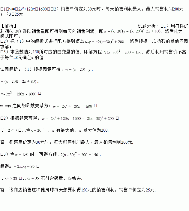 (3)如果物价部门规定这种健身球的销售单价不高于28元,该商店销售这种健身球每天要获得150元的销售利润,销售单价应定为多少元?