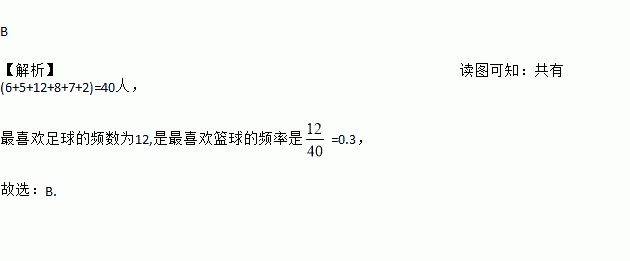 B 【解析】读图可知:共有(6+5+12+8+7+2)=40人, 最喜欢足球的频数为12,是最喜欢篮球的频率是=0.3, 故选:B.