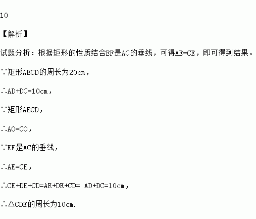 如图,矩形ABCD的周长为20cm,两条对角线相交于O点,过点O作AC的垂线EF,分别交AD、BC于E、F点,连结CE,则△CDE的周长为 cm.