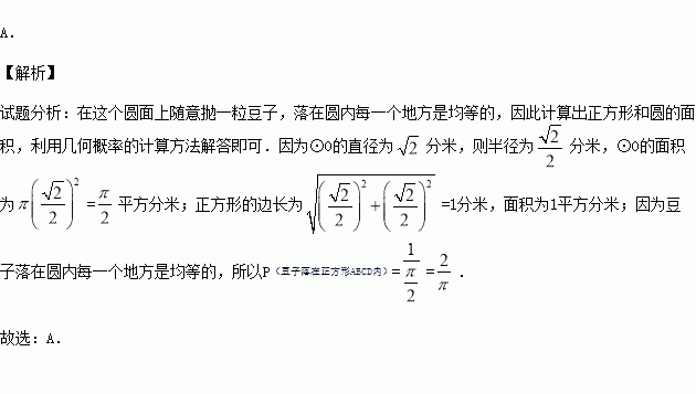 分米,若在这个圆面上随意抛一粒豆子,则豆子落在正方形ABCD内的概率是( ).