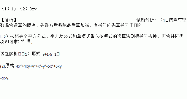 (1)1;(2)9xy 【解析】试题分析:(1)按照有理数混合运算的顺序,先乘方后乘除最后算加减,有括号的先算括号里面的. (2)按照完全平方公式、平方差公式和单项式乘以多项式的运算法则把括号去掉,再合并同类项即可求出结果. 试题解析:(1)原式=9+1-9=1; (2)原式=4x2+4xy+y2+x2-y2-5x2+5xy =9xy.