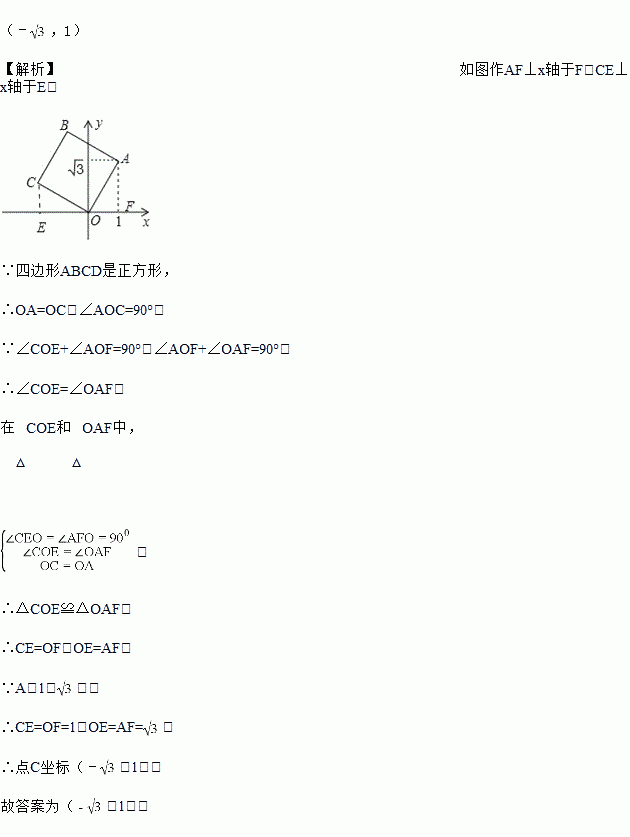 如图,将正方形OABC放在平面直角坐标系中,O是原点,A的坐标为(1,),则点C的坐标为_____.