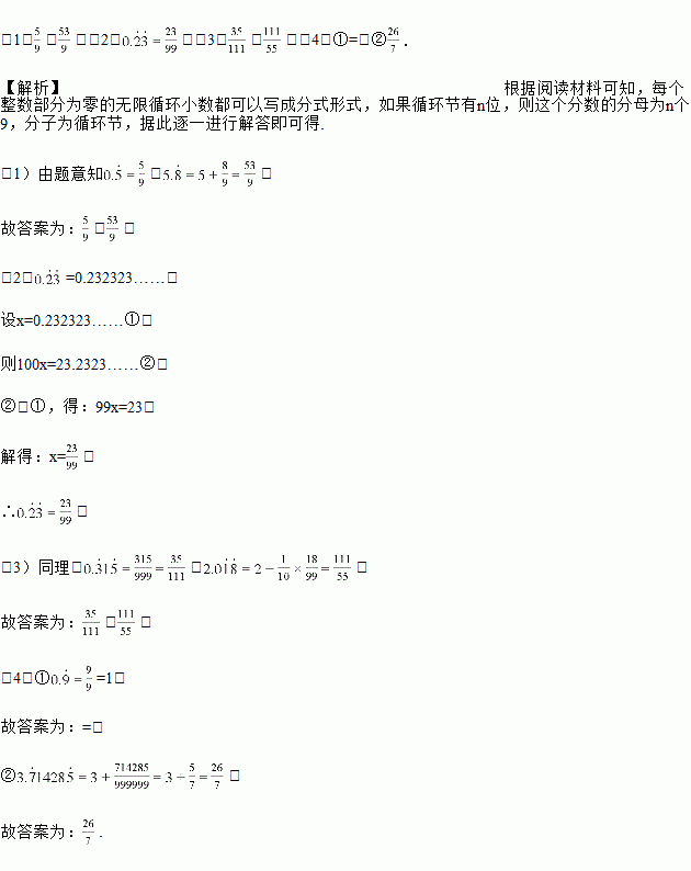 我们知道,有理数包括整数、有限小数和无限循环小数,事实上,所有的有理数都可以化为分数形式(整数可看作分母为1的分数),那么无限循环小数如何表示为分数形式呢?请看以下示例:
