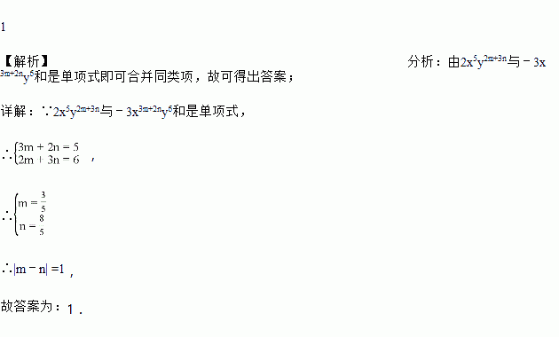 若单项式2x5y2m+3n与单项式﹣3x3m+2ny6的和是单项式,则 |m﹣n| =____.