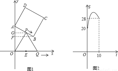 Èçͼ1£¬Õý·½ÐÎABCDµÄ¶¥µãA£¬BµÄ×ø±ê·Ö±ðΪ£¨0£¬10£©£¬£¨8£¬4£©£¬¶¥µãC£¬DÔÚµÚÒ»ÏóÏÞ£®µãP´ÓµãA³ö·¢£¬ÑØÕý·½Ðΰ´ÄæÊ±Õë·½ÏòÔ˶¯£¬Í¬Ê±£¬µãQ´ÓµãE£¨4£¬0£©³ö·¢£¬ÑØxÖáÕý·½ÏòÒÔÏàͬËÙ¶ÈÔ˶¯£®µ±µãPµ½´ïµãCʱ£¬P£¬QÁ½µãͬʱֹͣÔ˶¯£®ÉèÔ˶¯Ê±¼äΪt£¨s£©£®£¨1£©ÇóÕý·½ÐÎABCDµÄ±ß³¤£»