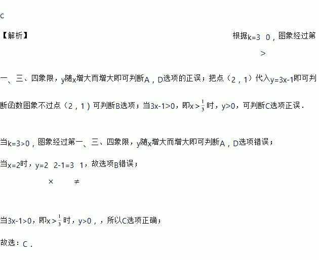 A. 随的增大而减小 B. 图象经过点(2,1) C. 当﹥时,﹥0 D. 图象不经过第四象限