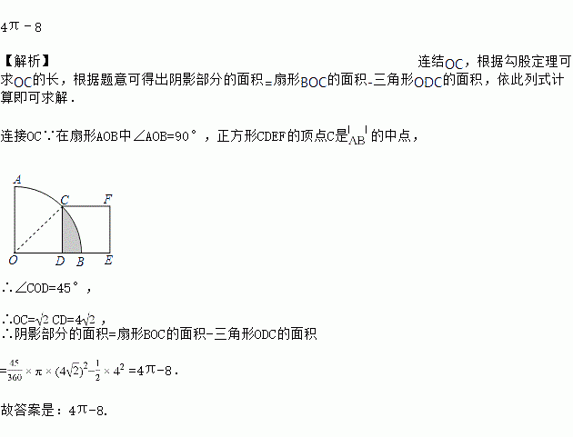 如图,在扇形AOB中,∠AOB=90°,正方形CDEF的顶点C是弧AB的中点,点D在OB上,点E在OB的延长线上,当正方形CDEF的边长为4时,阴影部分的面积为_____.
