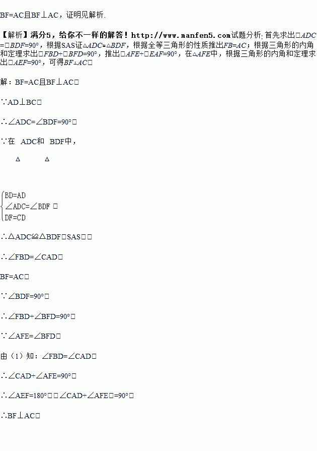 如图,△ABC中,AD⊥BC于D,若BD=AD,FD=CD.猜想:BF与AC的关系,并证明.
