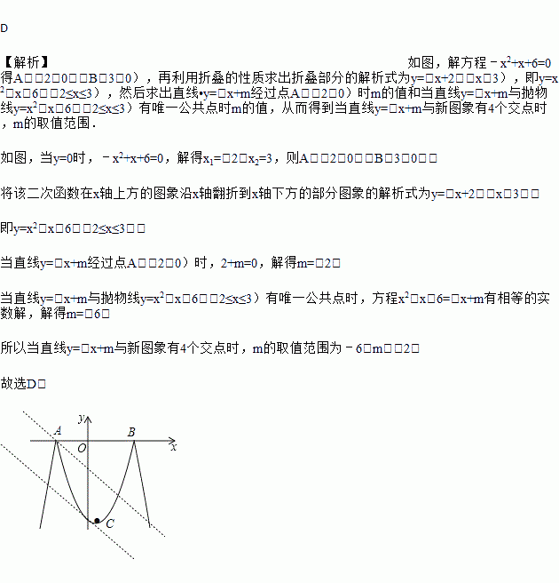 已知二次函数y=﹣x2+x+6及一次函数y=﹣x+m,将该二次函数在x轴上方的图象沿x轴翻折到x轴下方,图象的其余部分不变,得到一个新函数(如图所示),请你在图中画出这个新图象,当直线y=﹣x+m与新图象有4个交点时,m的取值范围是( )