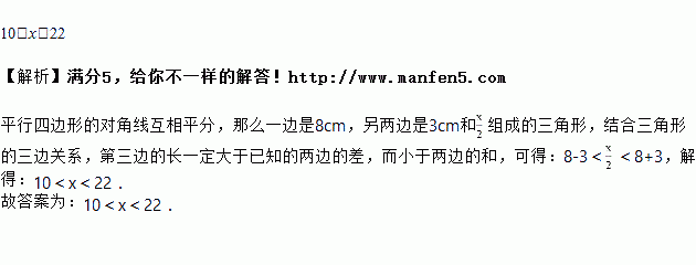 若平行四边形的一边长为8cm,一条对角线长为6cm,则另一条对角线长x(cm)的取值范围为_____。