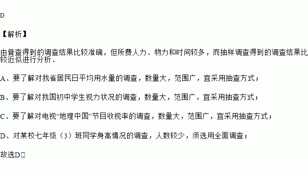 D. 对某校七年级(3)班同学身高情况的调查