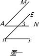 解:如图一,∵AM∥BE,∴∠A=∠3;∵AN∥BF,∴∠3=∠B;∴∠A=∠B.