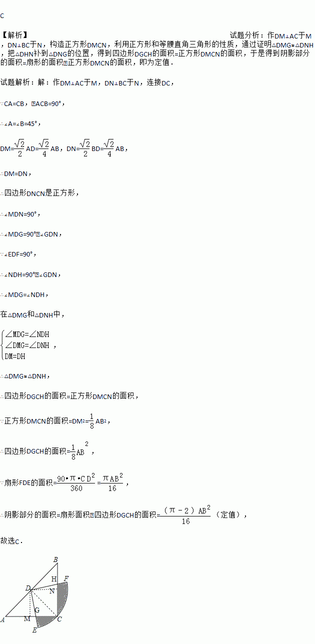 如图,在△ABC中,CA=CB,∠ACB=90°,以AB的中点D为圆心,作圆心角为90°的扇形DEF,点C恰在EF上,设∠BDF=α(0°<α<90°),当α由小到大变化时,图中阴影部分的面积( )