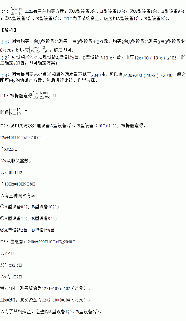 (2)市污水处理办公室由于资金缺乏,购买污水处理设备的资金最多105万元,你认为该有几种购买方案?