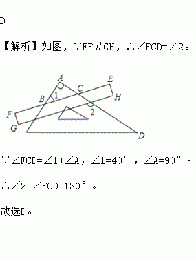 把一块直尺与一块三角板如图放置,若∠1=40°,则∠2的度数为【 】