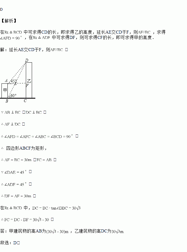 如图,甲、乙为两座建筑物,它们之间的水平距离BC为30日,在A点测得D点的仰角