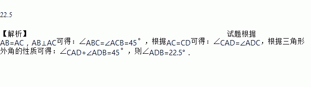 如图,AB⊥AC,点D在BC的延长线上,且AB=AC=CD,则∠ADB=__________°.