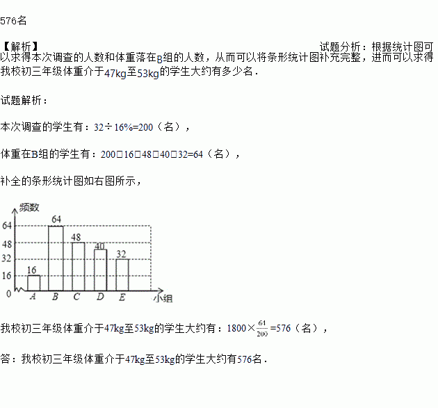补全条形统计图,并估计我校初三年级体重介于47kg至53kg的学生大约有多少名.