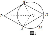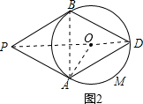 (2)如图2,连接AB、PD、OA.由菱形的两条对角线互相垂直、垂径定理证得点P、O、D三点共线;然后由菱形的对角线平分对角的性质、三角形外角定理推知扇形OAMD的圆心角