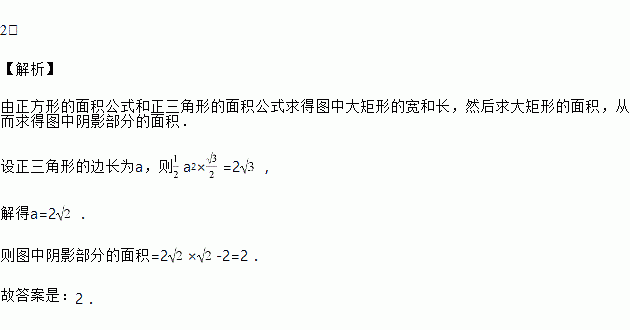 如图,正三角形和矩形具有一条公共边,矩形内有一个正方形,其四个顶点都在矩形的边上,正三角形和正方形的面积分别是2和2,则图中阴影部分的面积是 .