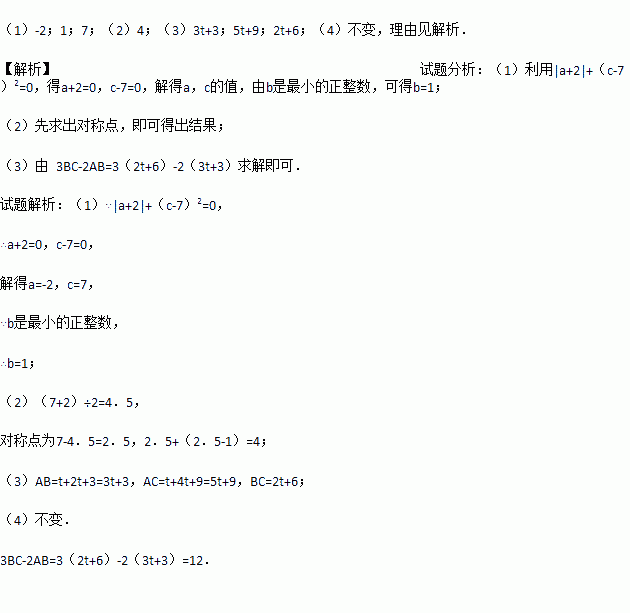 如图:在数轴上A点表示数a,B点示数b,C点表示数c,b是最小的正整数,且a,b满足+(c-7)2=0.