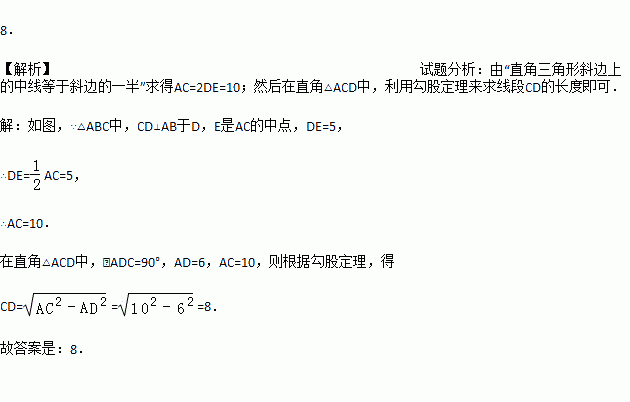 如图,△ABC中,CD⊥AB于D,E是AC的中点.若AD=6,DE=5,则CD的长等于 .