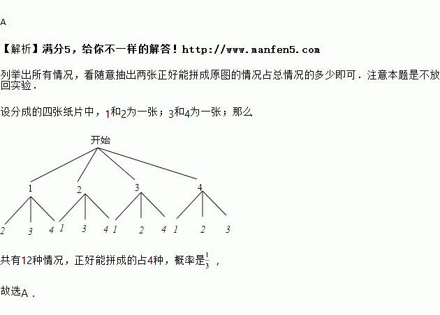 准备两张大小一样,分别画有不同图案的正方形纸片,把每张纸都对折、剪开,将四张纸片放在盒子里,然后混合,随意抽出两张正好能拼成原图的概率是( )