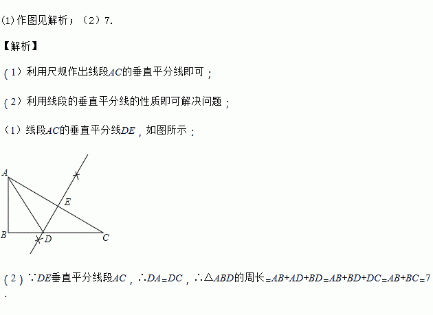 (1)利用尺规作线段AC的垂直平分线DE,垂足为点E,交BC于点D(保留作图痕迹,不写作法)