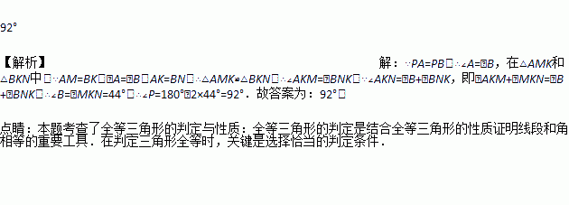 如图,在△PAB中,PA=PB,M,N,K分别是PA,PB,AB上的点,且AM=BK,BN=AK,若∠MKN=44°,则∠P的度数为 .