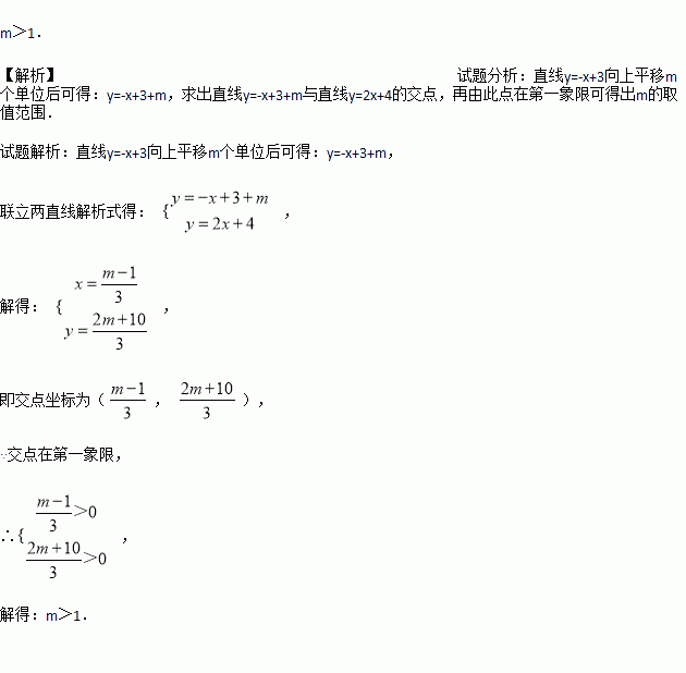 把直线y=-x+3向上平移m个单位后,与直线y=2x+4的交点在第一象限,则m的取值范围是_________.