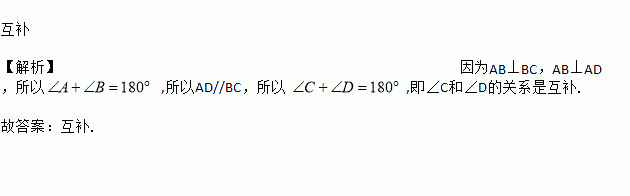 如图,AB⊥BC于B,AB⊥AD于A,则∠C和∠D的关系是__________.