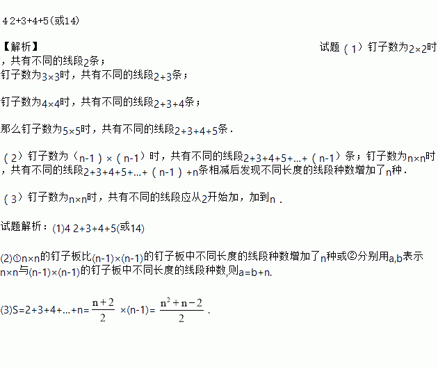 (2)写出(n-1)×(n-1)和n×n的两个钉子板上,不同长度值的线段种数之间的关系;(用式子或语言表述均可).
