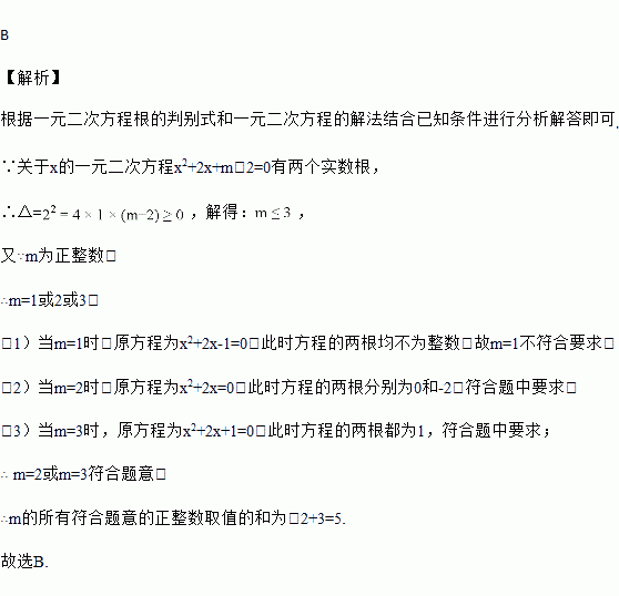 已知关于x的一元二次方程x2+2x+m﹣2=0有两个实数根,m为正整数,且该方程的根都是整数,则符合条件的所有正整数m的和为( )