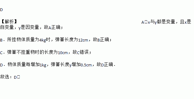 D 【解析】A.x与y都是变量,且x是自变量,y是因变量,故A正确; B.所挂物体质量为4kg时,弹簧长度为12cm,故B正确; C.弹簧不挂重物时的长度为10cm,故C错误; D.物体质量每增加1kg,弹簧长度y增加0.5cm,故D正确. 故选:D.